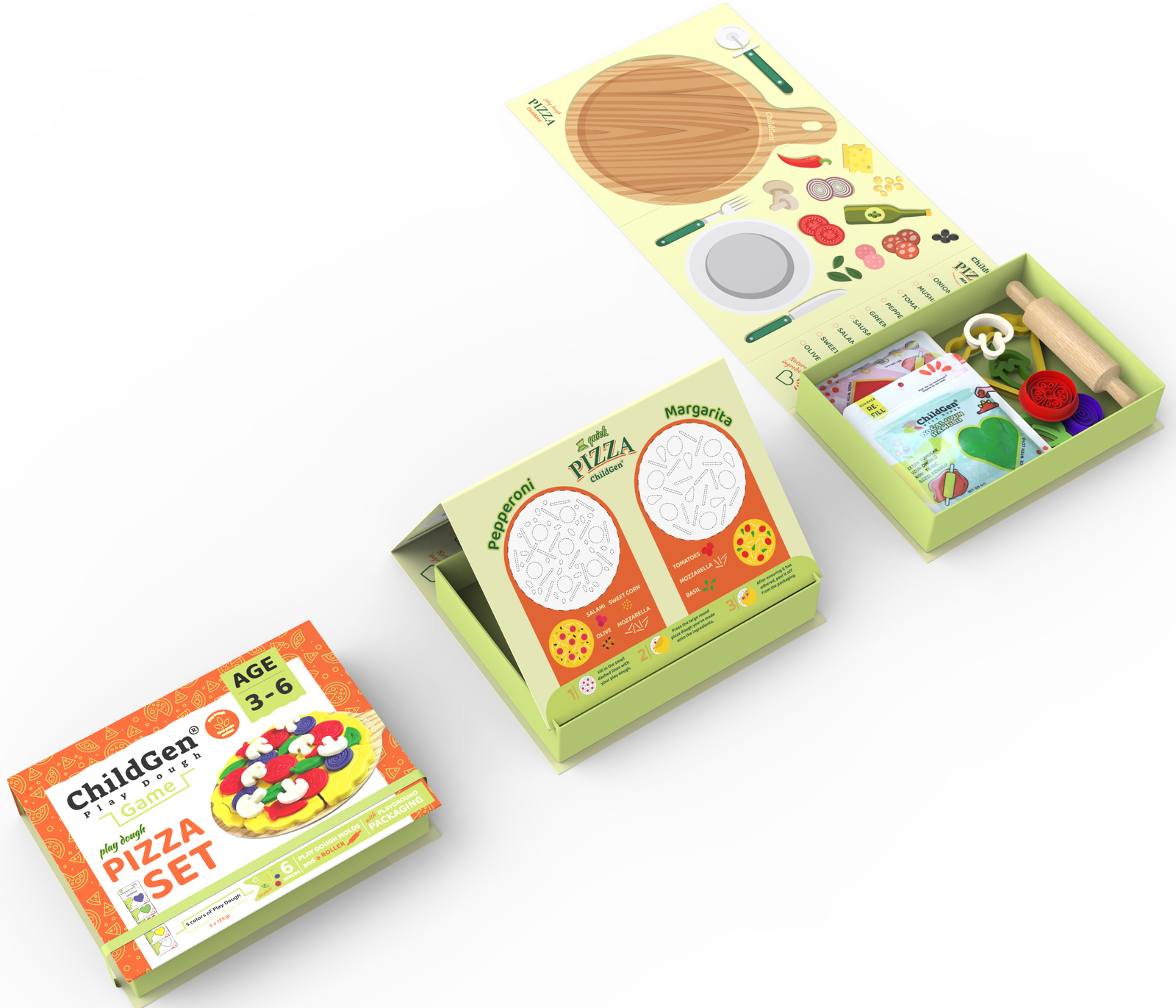 The ChildGen Pizza Creative Set offers a fun, imaginative experience with natural play dough! Packaged in a foldable box full of activities, it engages children and develops fine motor skills. Inside, kids will find pizza illustrations and can recreate toppings like cheese, tomatoes, salami, and mushrooms using the play dough.
