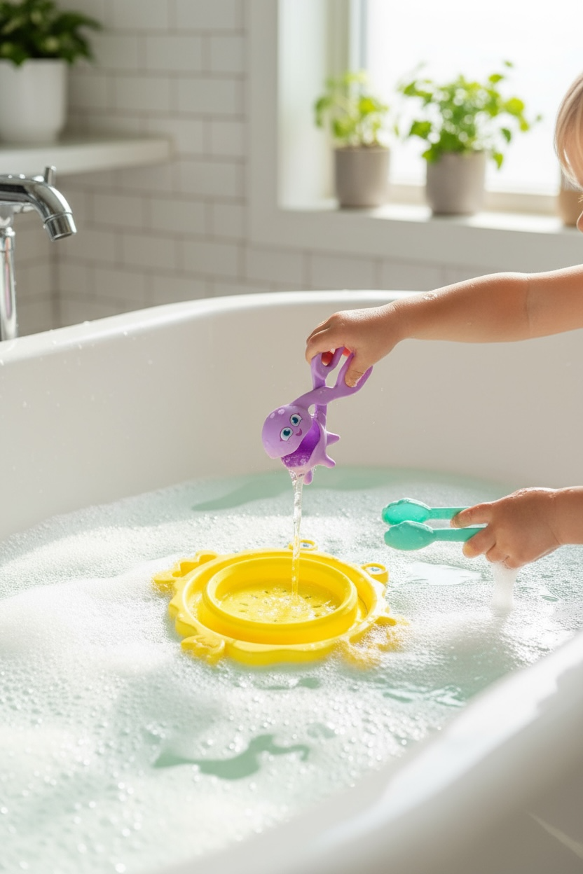 - Grab, sift, and scoop bath toys with our bath toy set.