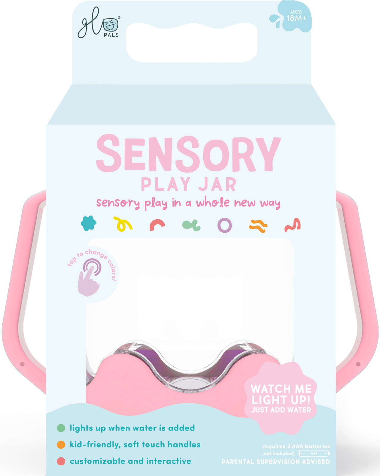 How to care for your sensory play jar: Remove all contents and liquid after playtime. Hand wash ONLY with soap and water. Please keep the battery compartment dry and do not submerge your jar in water. To turn the jar OFF, simply turn it over and rest it upside down. This will deactivate the liquid activation technology, extending your battery life.