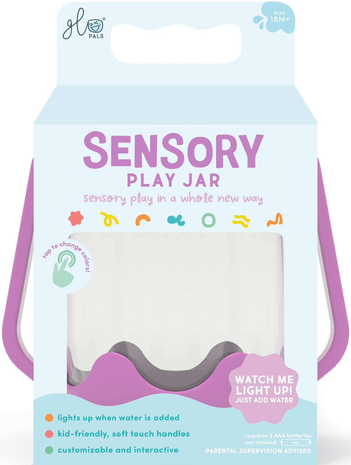 The Glo Pals sensory jar is available in 4 colors: blue, red, purple, and green. Additionally, you can enhance the fun by adding Glo Pals glowing sensory cubes for an even more exciting experience!