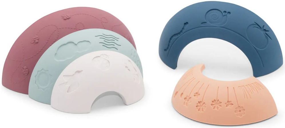 A tactile and sophisticated version of this playroom classic. 5 stacking rainbow arches made from food-grade, dishwasher-safe silicone.