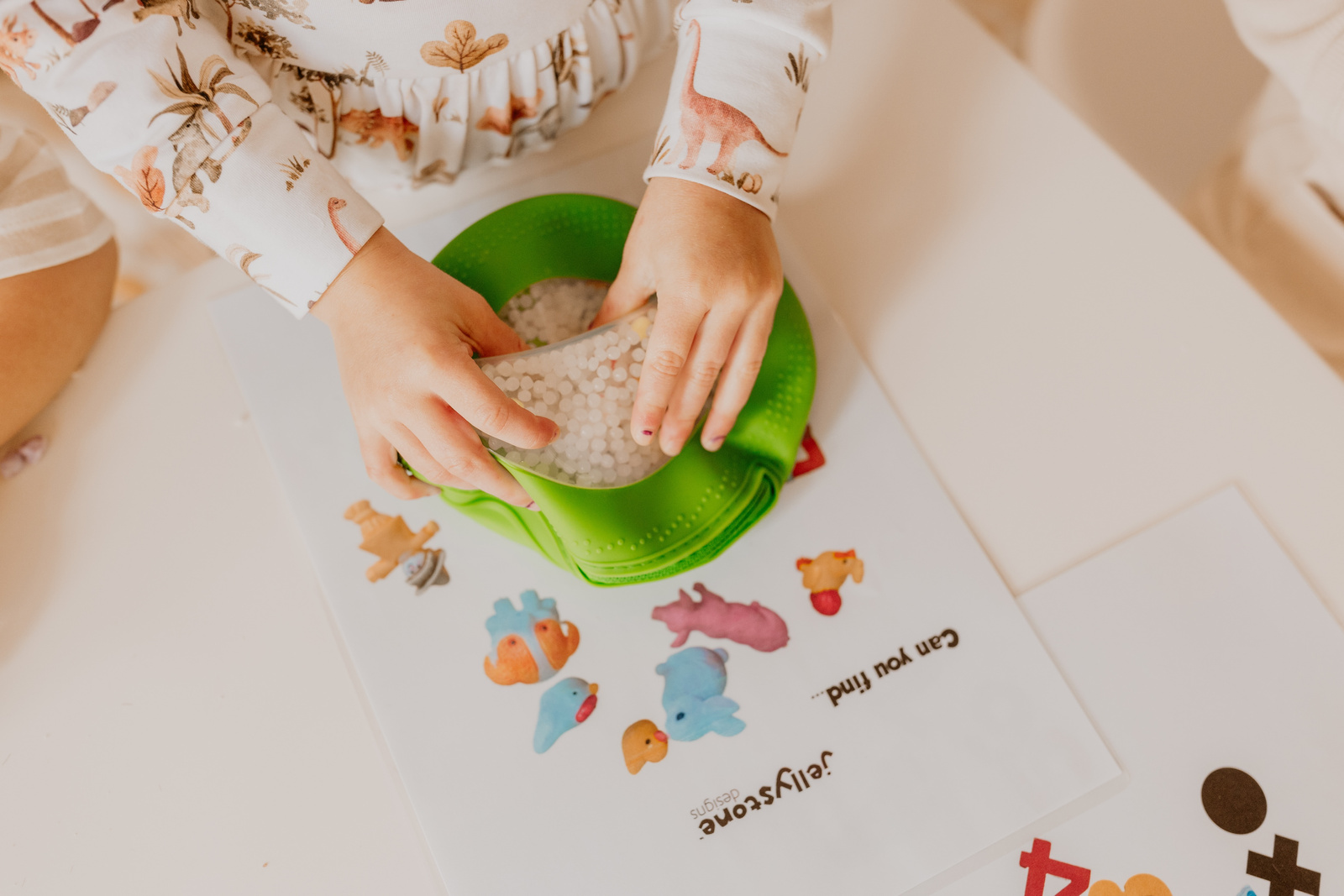 Discover the squishy & tactile portable sensory toy! The Peekaboo Sensory Bag is filled with weighted beads and fun themed figurines for little ones to discover. All the sensory feedback they need without the mess! It is perfectly designed to engage sight, touch and sound while helping to calm and relax. The Peekaboo Bag comes totally sealed & safe for little ones to explore.