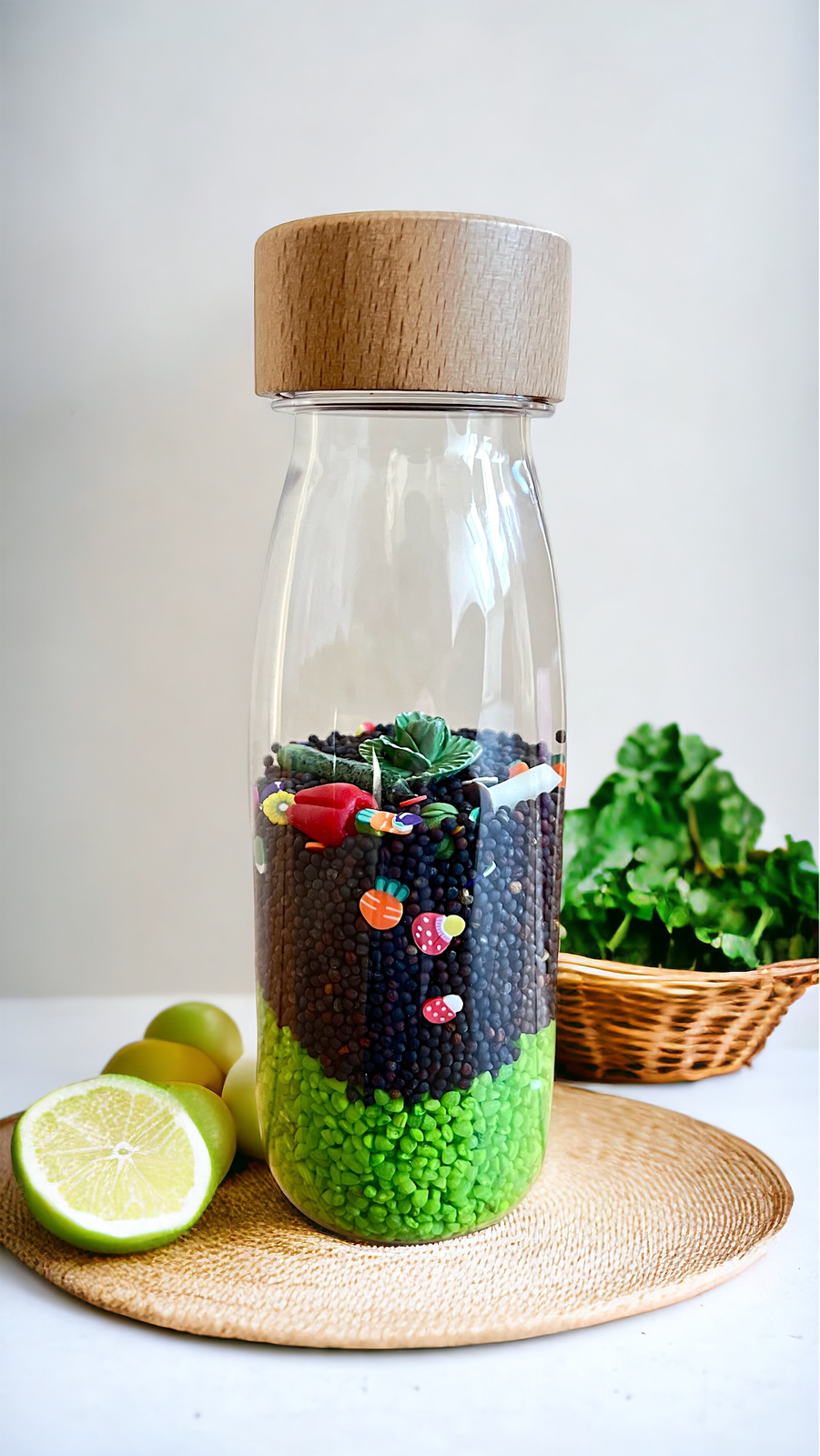 Petit Boum sensory bottles are a colorful world enclosed in a small, child-friendly format. They entertain, educate, and stimulate the imagination! Let your child move, shake, and explore the bottle to find the hidden, colorful vegetables! Green lettuce, cucumber, red bell pepper, or maybe a carrot? What vegetable will your child discover? The Vegetables Bottle is a fantastic aid in introducing new and healthy foods into your child’s diet. It encourages learning and naming vegetables, which are an essential part of our meals.