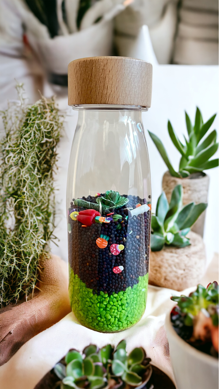 The colors of Petit Boum bottles are inspired by nature and our planet. They thematically match the small figurines inside, representing animals and plants. These bottles help children relax and support them in managing tension and anxiety that can arise from overstimulation or while exploring their ever-expanding world.