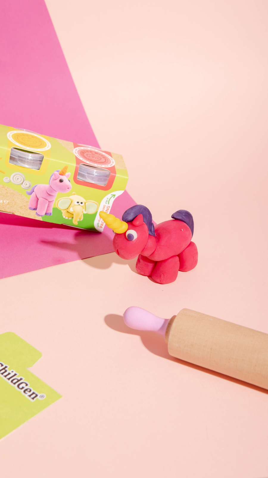 Zestaw zawiera cztery kubeczki lekkiej ciastoliny w kolorach: biały, różowy, fioletowy, żółty. Całość jest zapakowana w papierowe opakowanie, które po rozłożeniu zmienia się w specjalną kartę z plastycznymi zadaniami dla dziecka – może ono tworzyć kształty takie jak jajko dinozaura, ogrodzenie dla konika czy kolorowy róg jednorożca! Tematykę ukrytej w środku karty zdradza ilustracja na zewnątrz opakowania - w tym przypadku jest to jednorożec.