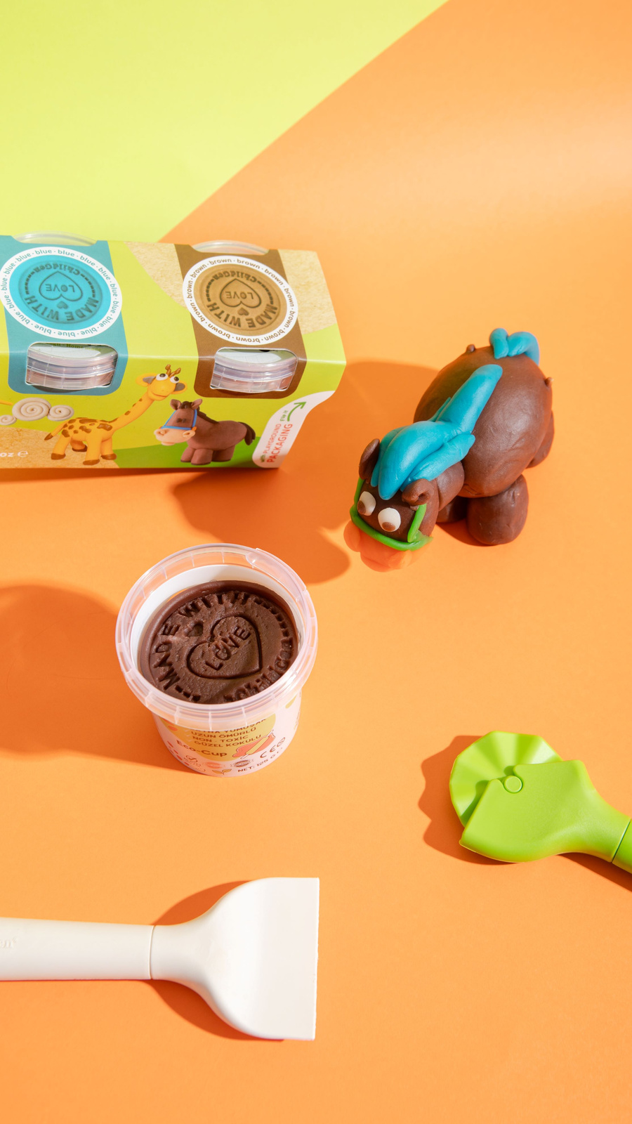 Zestaw zawiera cztery kubeczki lekkiej ciastoliny w kolorach: brązowy, niebieski, pomarańczowy i zielony. Całość jest zapakowana w papierowe opakowanie, które po rozłożeniu zmienia się w specjalną kartę z plastycznymi zadaniami dla dziecka – może ono tworzyć kształty takie jak jajko dinozaura, ogrodzenie dla konika czy kolorowy róg jednorożca! Tematykę ukrytej w środku karty zdradza ilustracja na zewnątrz opakowania - w tym przypadku jest to konik.