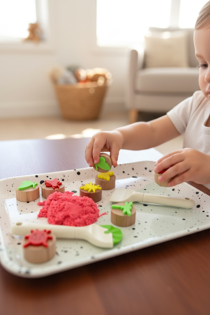 Tworzenie figur geometrycznych: Szpatułką można wycinać podstawowe figury geometryczne (koła, kwadraty, trójkąty), co pomaga w nauce kształtów i rozwijaniu wyobraźni przestrzennej.
