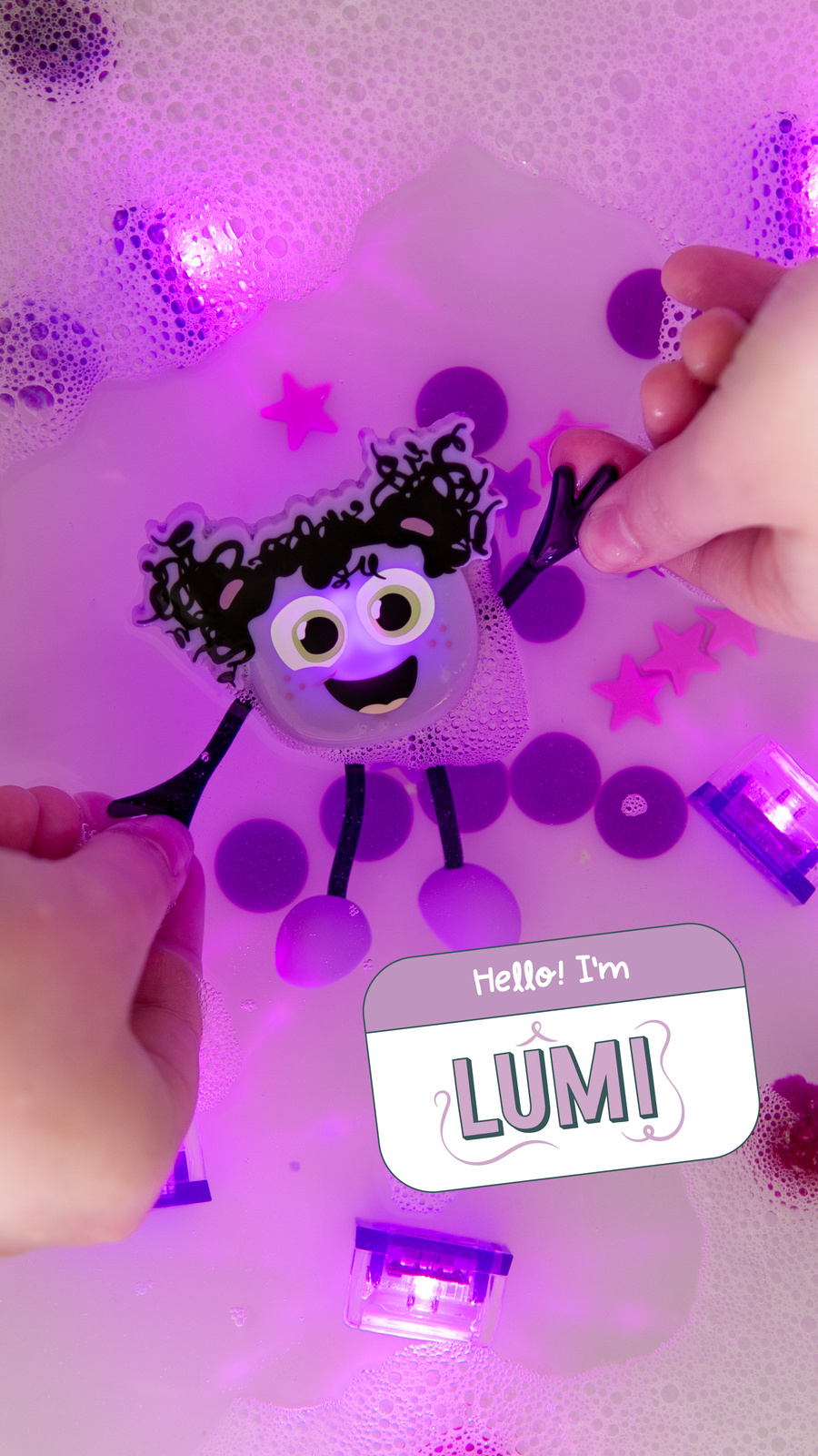 Jeśli pragniesz, żeby kumpel Lumi świecił w wodzie, umieść dołączoną do zestawu kostkę w wyznaczone miejsce z tyłu postaci (na plecach:)). Zanurz postać w wodzie i obserwuj jak świeci. Świetna zabawa gwarantowana!