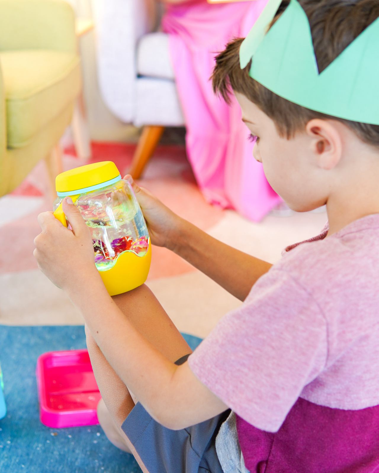 Dodatkowo, możesz wzbogacić zabawę, dodając do słoika świecące kostki sensoryczne Glo Pals, które sprawią, że zabawa będzie jeszcze ciekawsza!