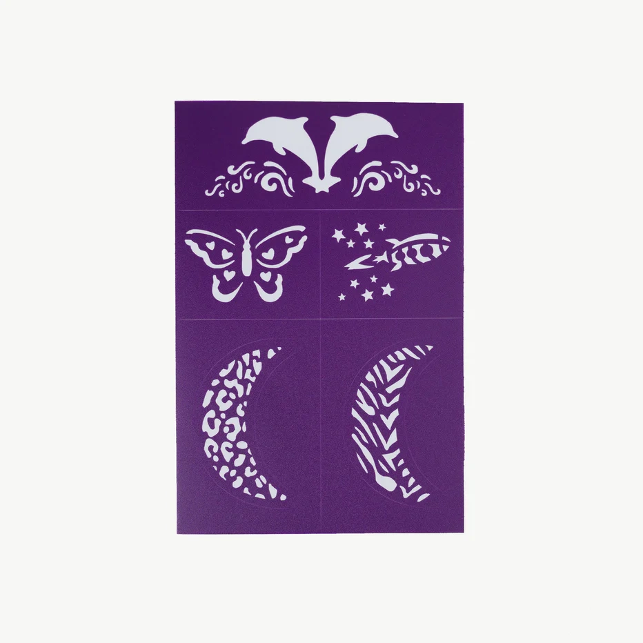Oh Flossy, Kolorowe szablony do malowania twarzy wielokrotnego użytku – fioletowy zestaw (6 arkuszy)