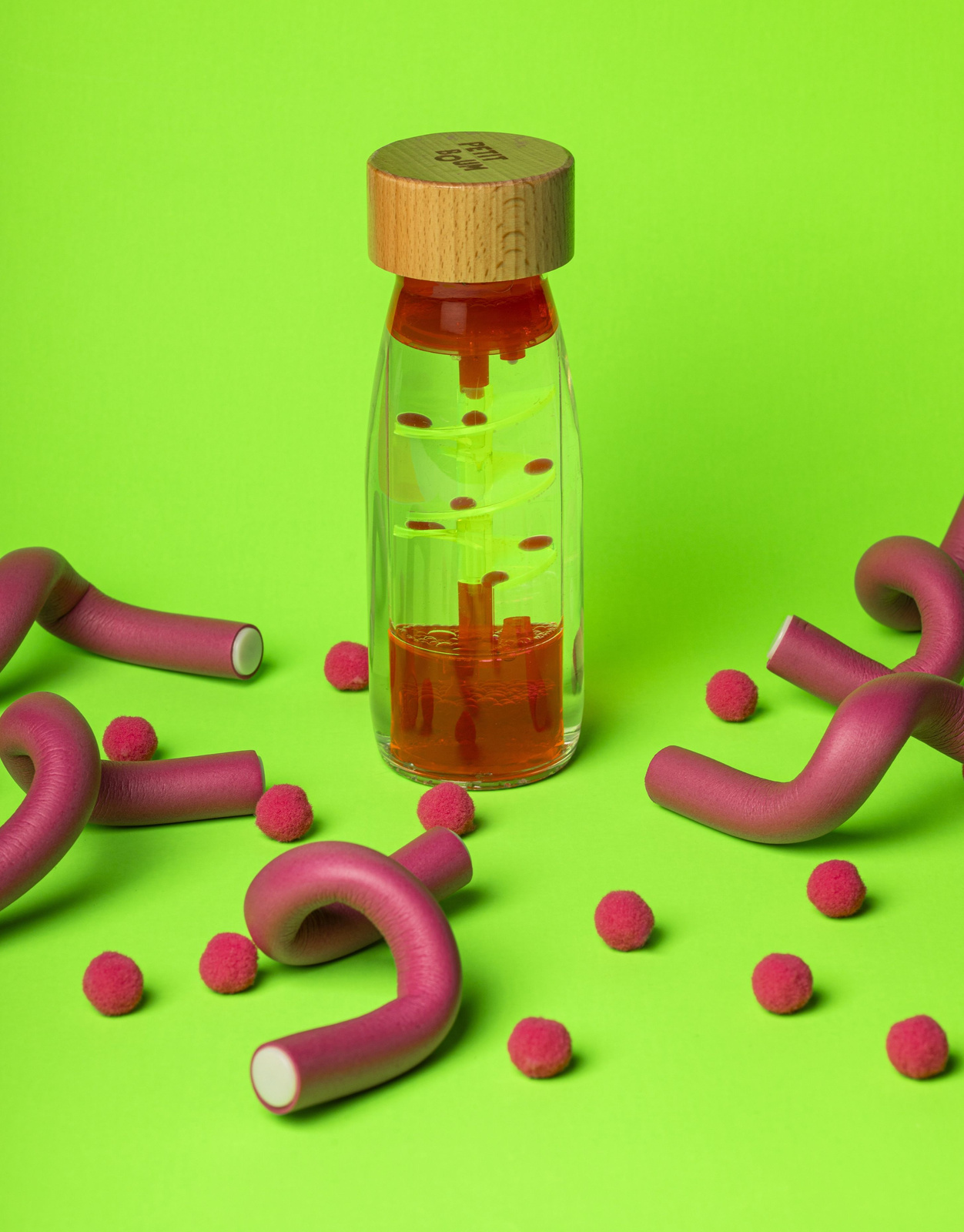 Butelki od Petit Boum bawią, uczą i stymulują wyobraźnię! Obserwowanie zachwycającego świata barw oraz przepływającego i połyskującego brokatu wprawi dziecko w błogi stan relaksu i spokoju. Skupienie uwagi na pływających elementach pomoże w nauce koncentracji i uważności.